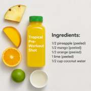 Tropical Pre-WorkoutIngredients: 1/2 pineapple (peeled) 1/2 mango (peeled) 1/2 orange (peeled) 1 lime (peeled) 1/2 cup coconut water Benefits: This tropical juice is rich in natural sugars for quick energy, while coconut water hydrates and replenishes electrolytes, making it a great pre-workout option.